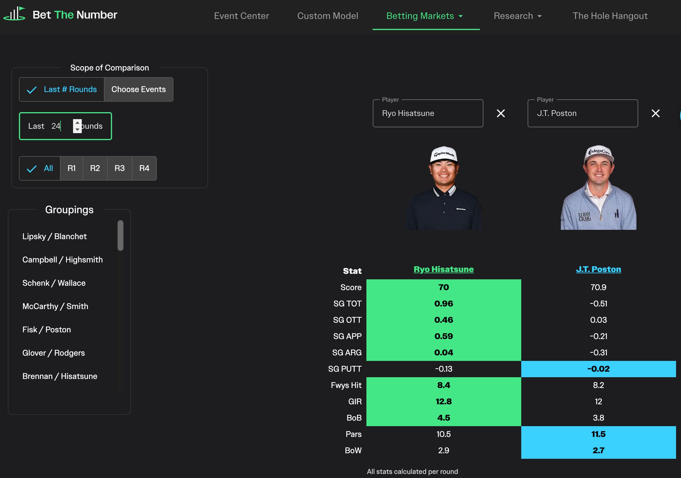 The BTN Matchup Tool likes Ryo too, and that helps seal it. Over the last 24 rounds, he holds the edge in several key categories, including Strokes Gained: Total, Off the Tee, and Approach. He’s also been the more consistent tee-to-green player, which is usually a pretty good recipe at Harbour Town, where precision matters a whole lot more than just bombing driver all over creation.