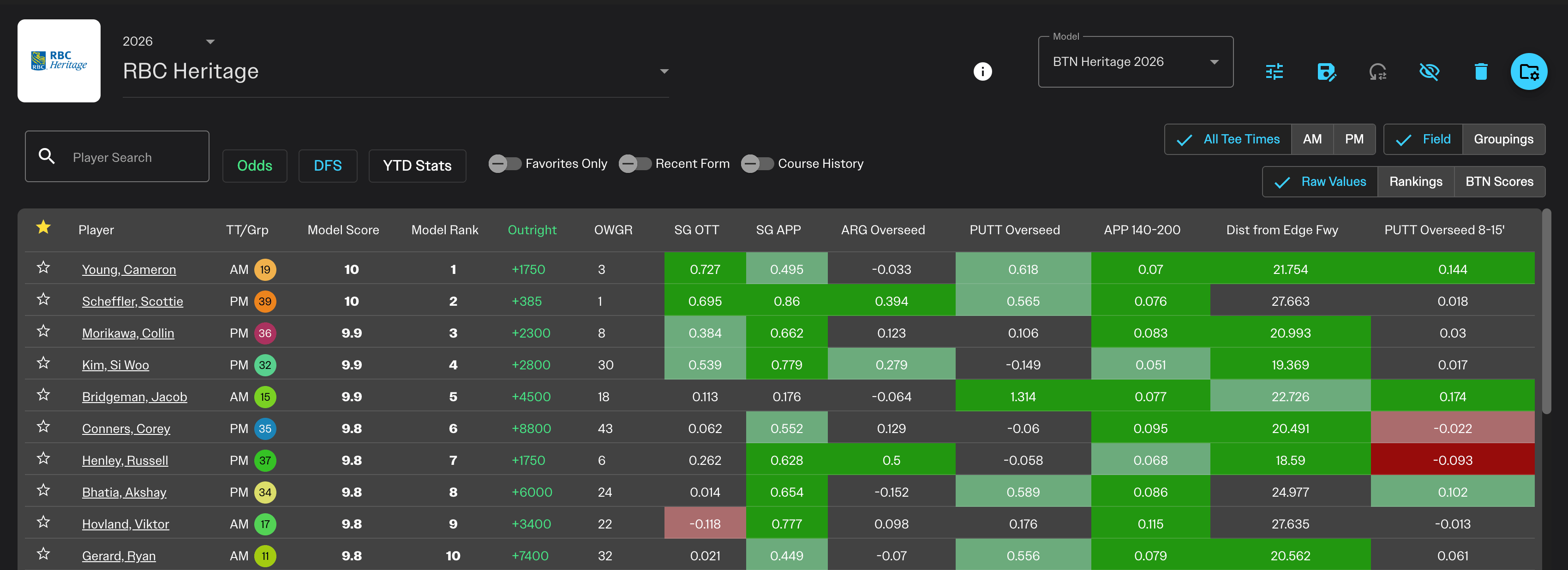 This week’s top 10 in the BTN Model, with Cameron Young & Scottie Scheffler as the favorites.