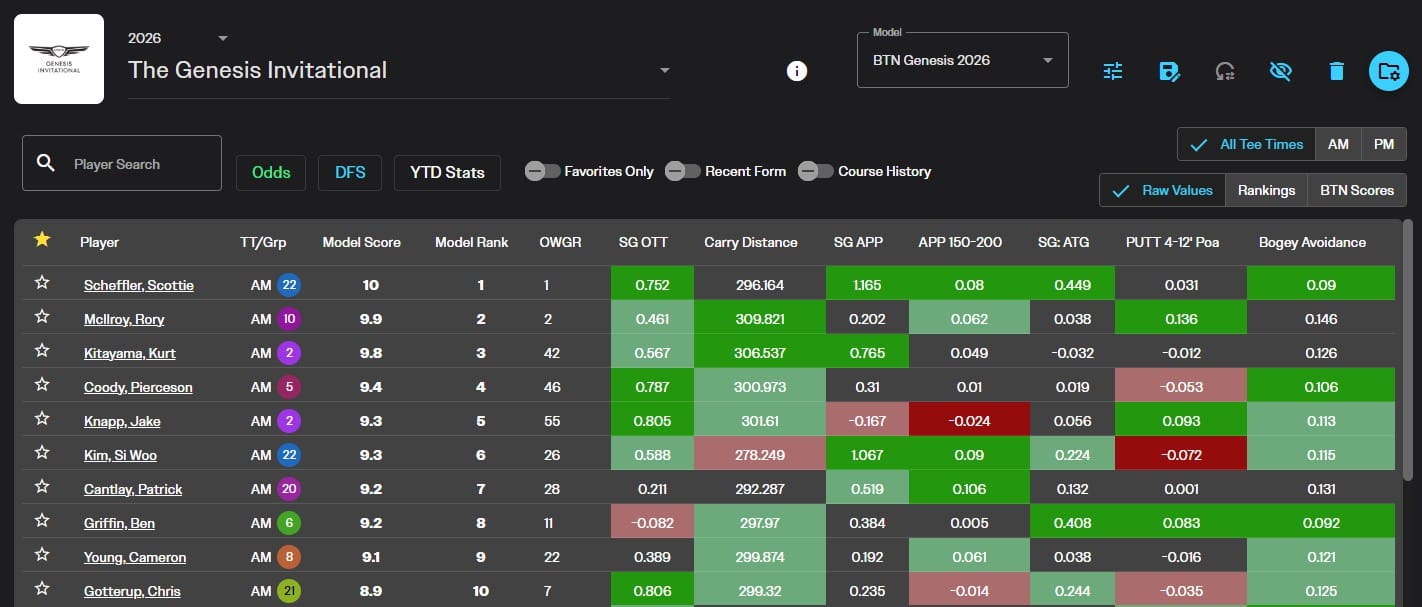 This week’s BTN Model favorite is (🥁 drumroll please…) Scottie Scheffler. Scottie is the favorite every week, so let’s shed some light on another guy in our top 10. The one that stands out to me is Patrick Cantlay. Cantlay has pretty strong course history at Riviera and comes in at #7 this week with some sneaky T15s at the AT&T and AmEx, though he did MC at the Farmers.