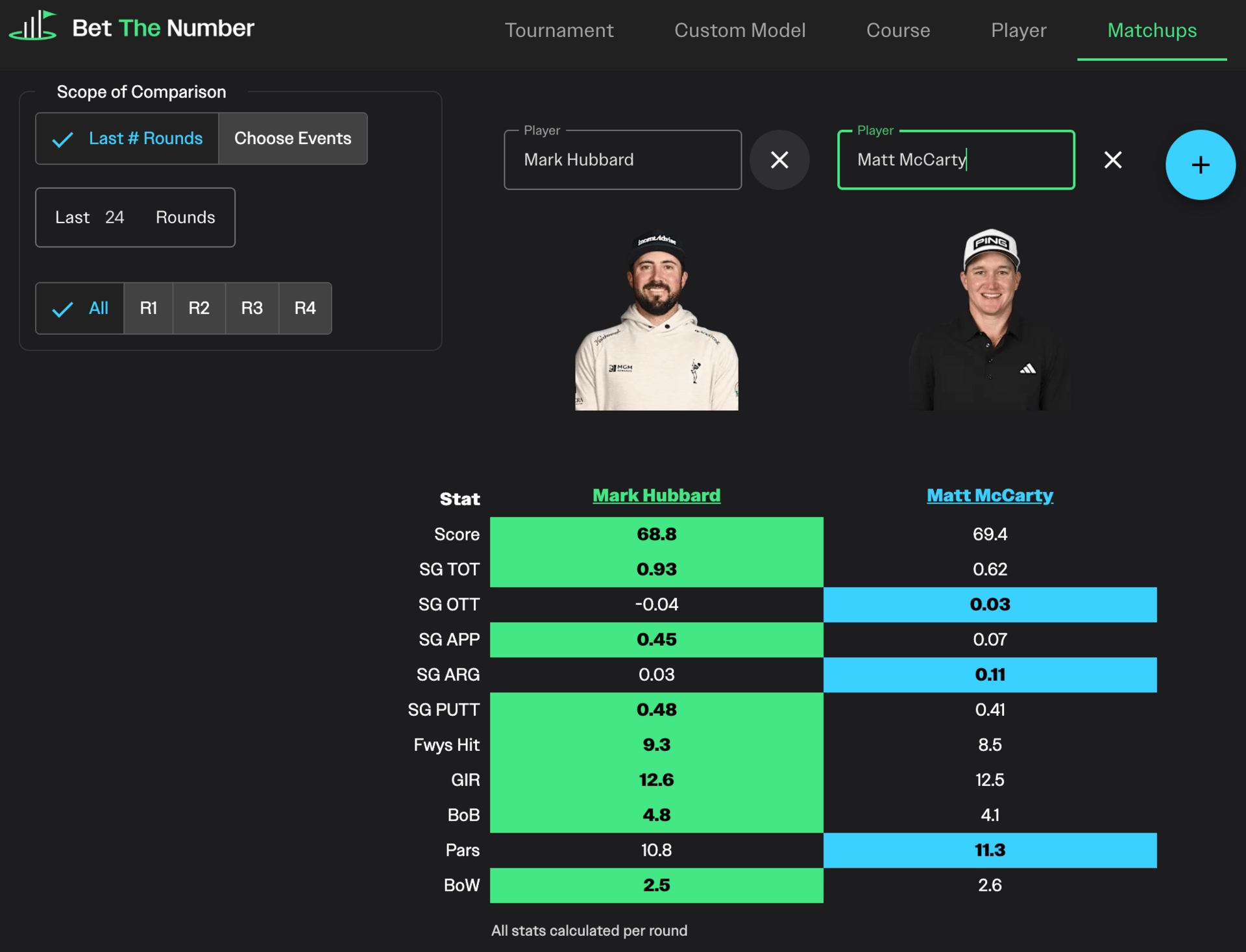 The books may have this one dead even, but we see a clear edge with Mark Hubbard this week over Matt McCarty. The BTN Matchup Tool backs it up, giving “Homeless Hubbs” the nod across most key stats. Hubbard is trending nicely — coming off a T3 at the Wyndham— and he loves Silverado, cashing top-25 finishes in 3 of his last 5 trips here. McCarty, meanwhile, is making his debut at this track. That’s a tall order against a guy with proven course chops and recent momentum. It might look like a coin flip on paper, but we’re siding with Hubbs to keep you from being down in the dumps and get you headed straight to the cash-out window in Napa. Cheers!