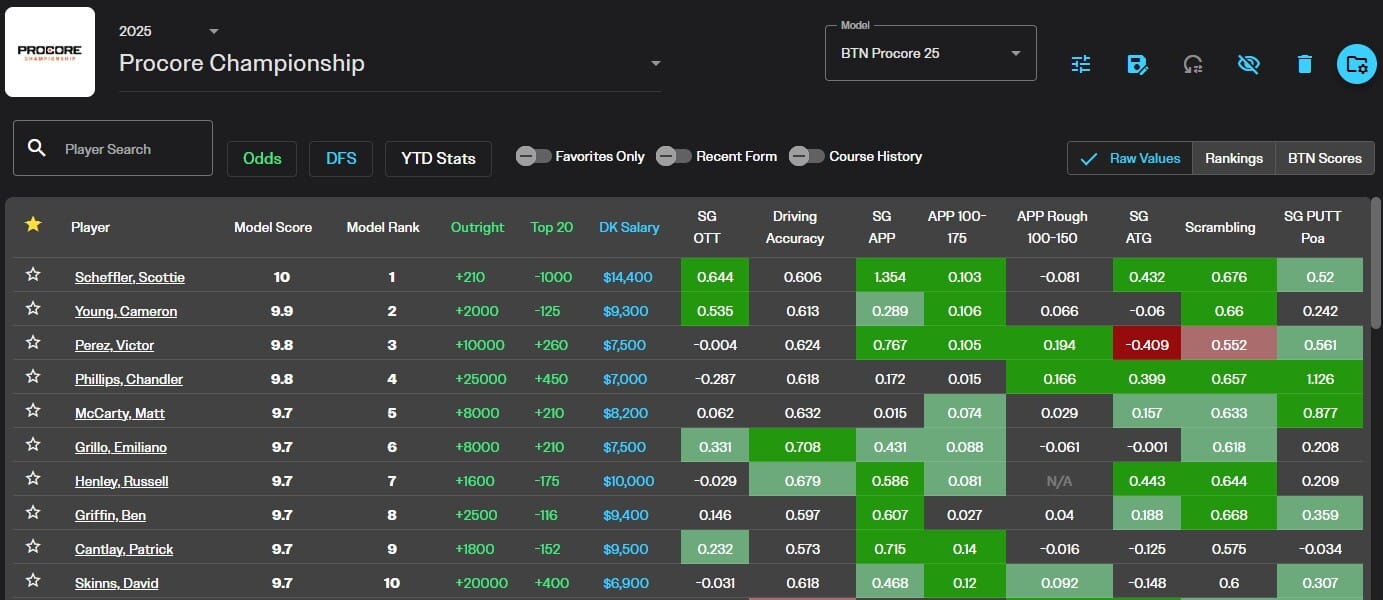 This week’s BTN Model favorite is (🥁 drumroll please…) Scottie Scheffler. Interestingly though, none of Scottie’s Ryder Cup teammates have cracked the top 5 of the BTN model, though we do see Russell Henley, Ben Griffin, and Patrick Cantlay coming in at 7, 8, and 9 respectively.