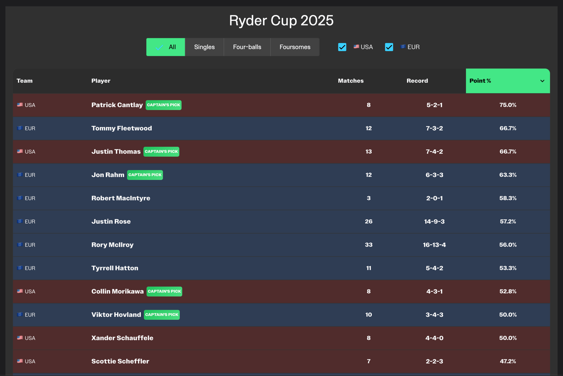 This week’s Feature Spotlight: Ryder Cup Page. Right now we’re just showing you the Ryder Cup performance of every player in this field. You can sort by team, format, number of matches and Point %. Call this version 1, with a lot more to come in the future.