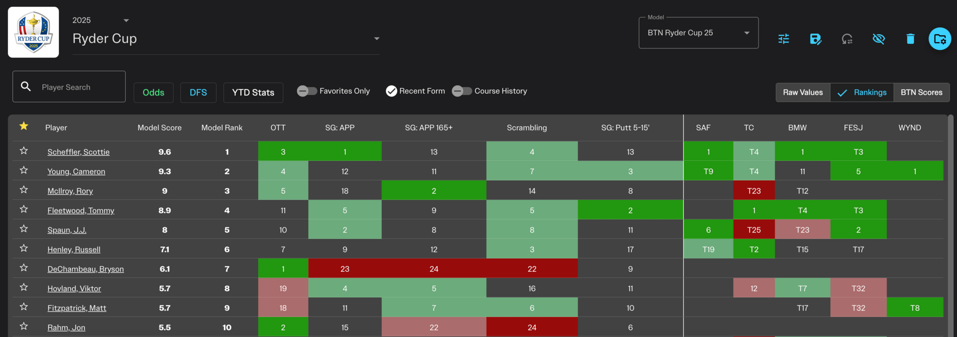 This week’s BTN Model favorite is Scottie Scheffler, scoring a near perfect 9.6. Our top 10 is rounded out with 5 Americans and 5 Europeans… a recipe for an EXCITING Ryder Cup weekend.